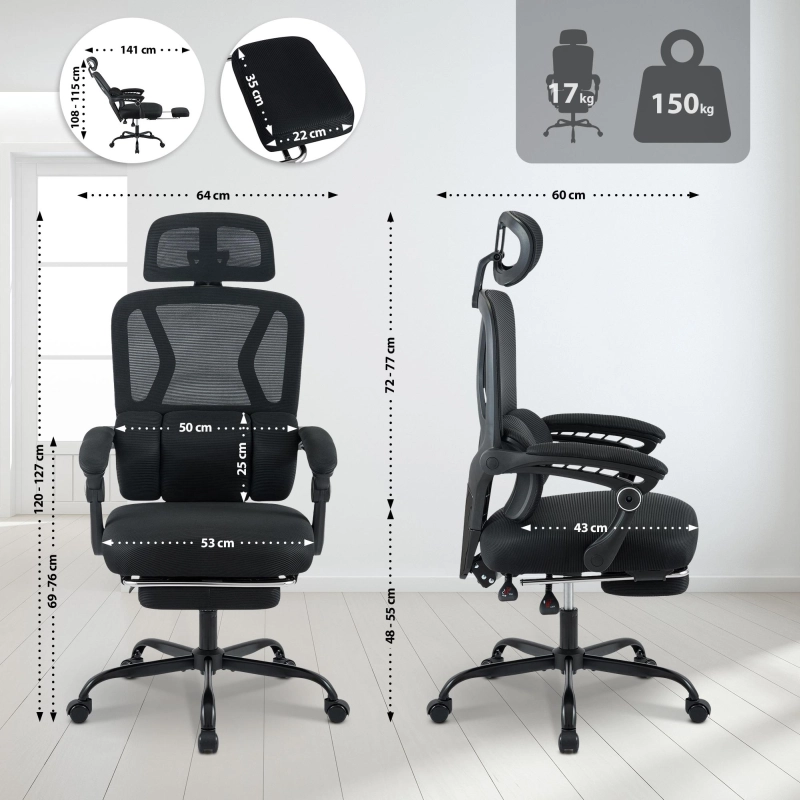 Wyposażony w regulowaną podpórkę lędźwiową, dba o odciążenie kręgosłupa w dolnym odcinku. Zagłówek z możliwością regulacji wysokości oraz funkcja odchylenia oparcia do 135° pozwalają na indywidualne dopasowanie fotela do potrzeb użytkownika.