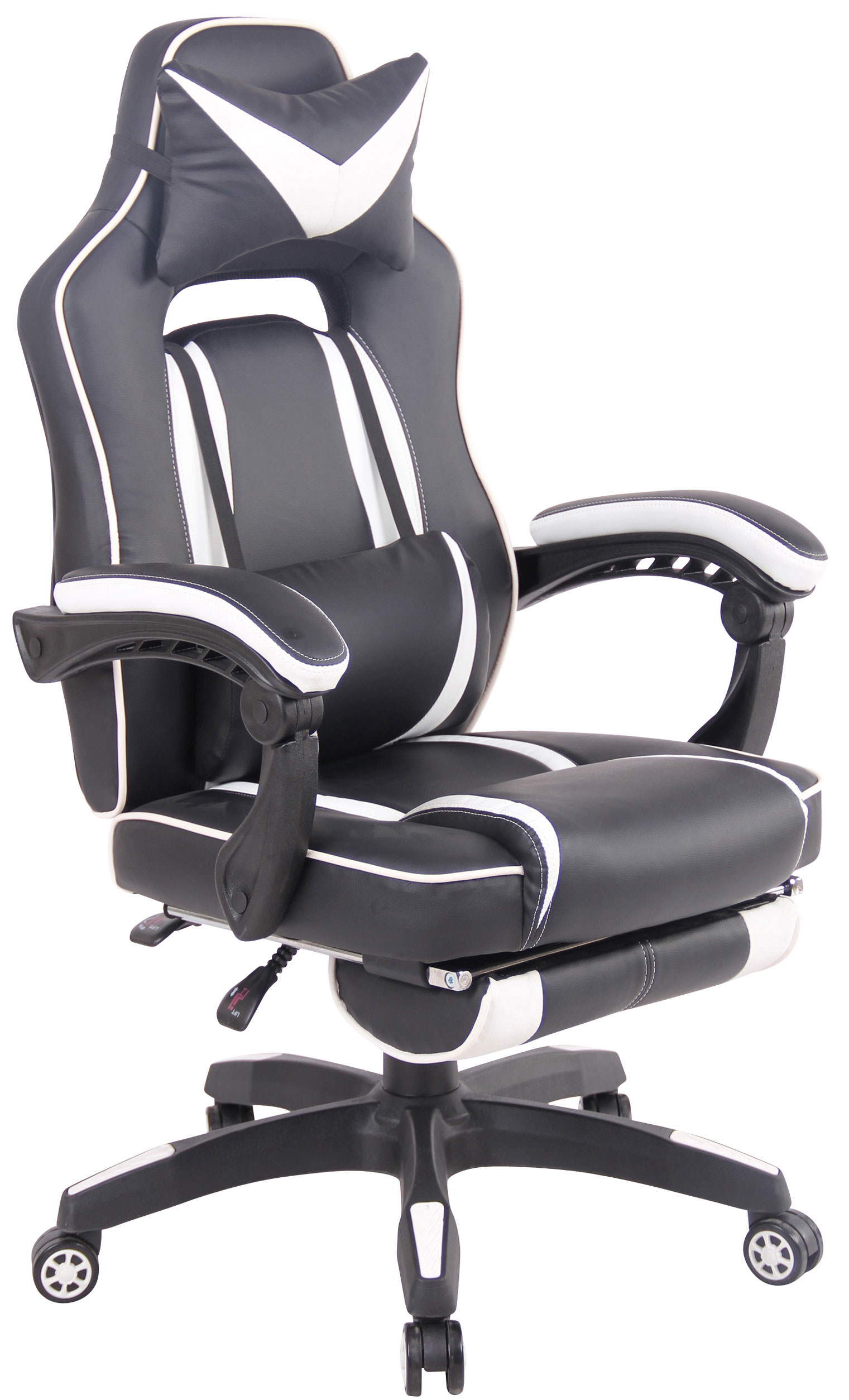 Krzesło biurowe o atrakcyjnym, sportowym designie łączy w sobie funkcjonalność i wygodę w najlepszy możliwy sposób. Przyjemnie tapicerowane siedzisko i podłokietniki pokryte są łatwą w pielęgnacji imitacją skóry. Zdejmowane poduszki pod szyję i odcinek lędźwiowy zapewniają nie tylko zdrową pozycję siedzącą, ale także długotrwały komfort. Łatwo regulowane oparcie i zintegrowany podnóżek zapewniają również przyjemną przerwę pomiędzy nimi.Krzesło biurowe Stoi stabilnie na pięciu płynnie poruszających się kółkach i plastikowej ramie. Nie ma znaczenia, czy jest to podłoga twarda, czy wyłożona wykładziną – zawsze możesz łatwo przesuwać po podłodze.